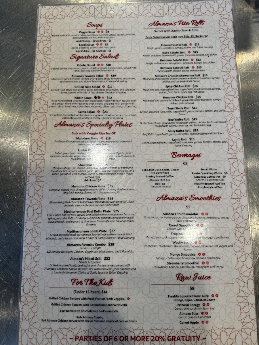 Completing the experience are refreshing smoothies and an excellent selection of wines, making Almaza Grill an ideal choice for both casual diners and special occasions. With generous portions and an authentic atmosphere, you'll find a true taste of Lebanon here.